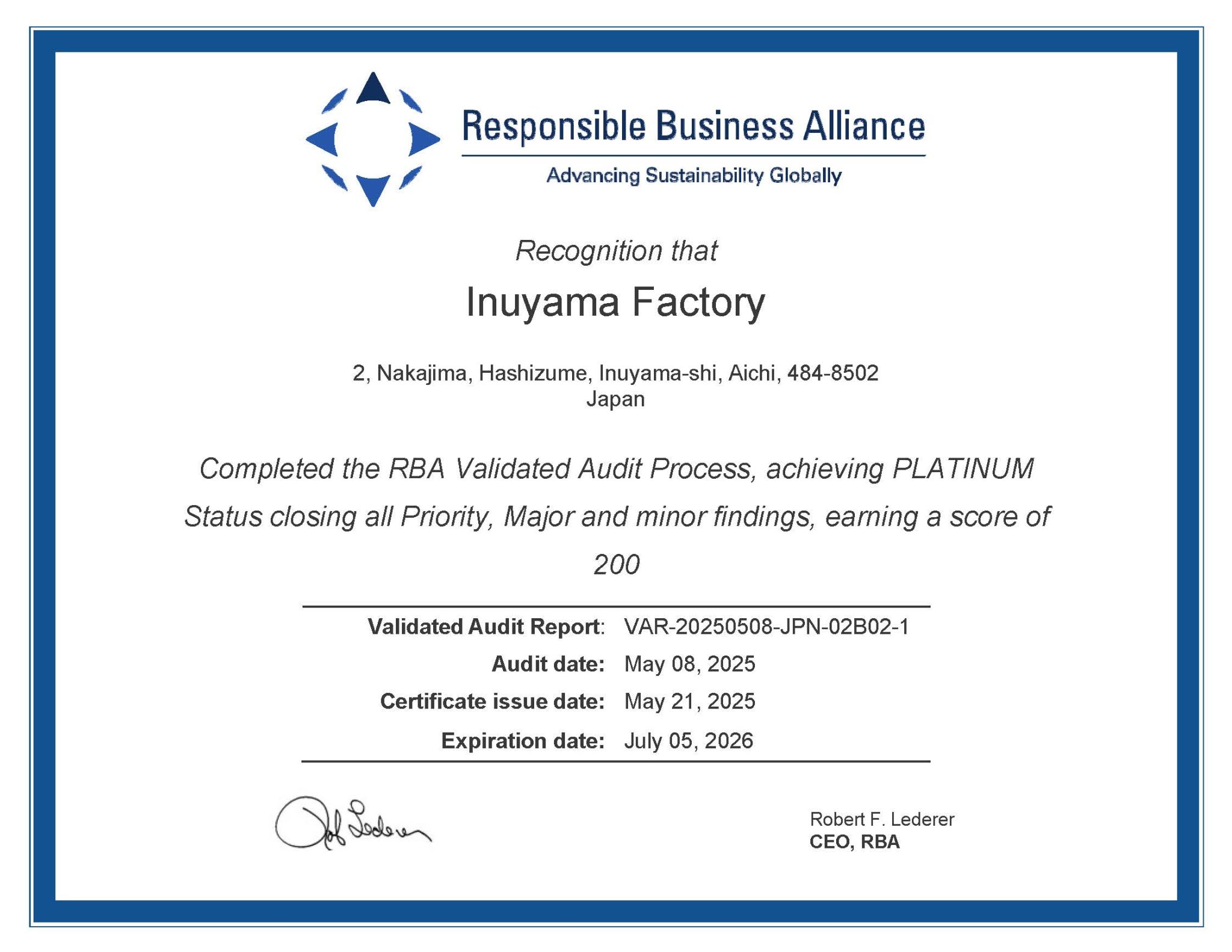 Inuyama Plant Achieves Platinum Status in RBA VAP Audit