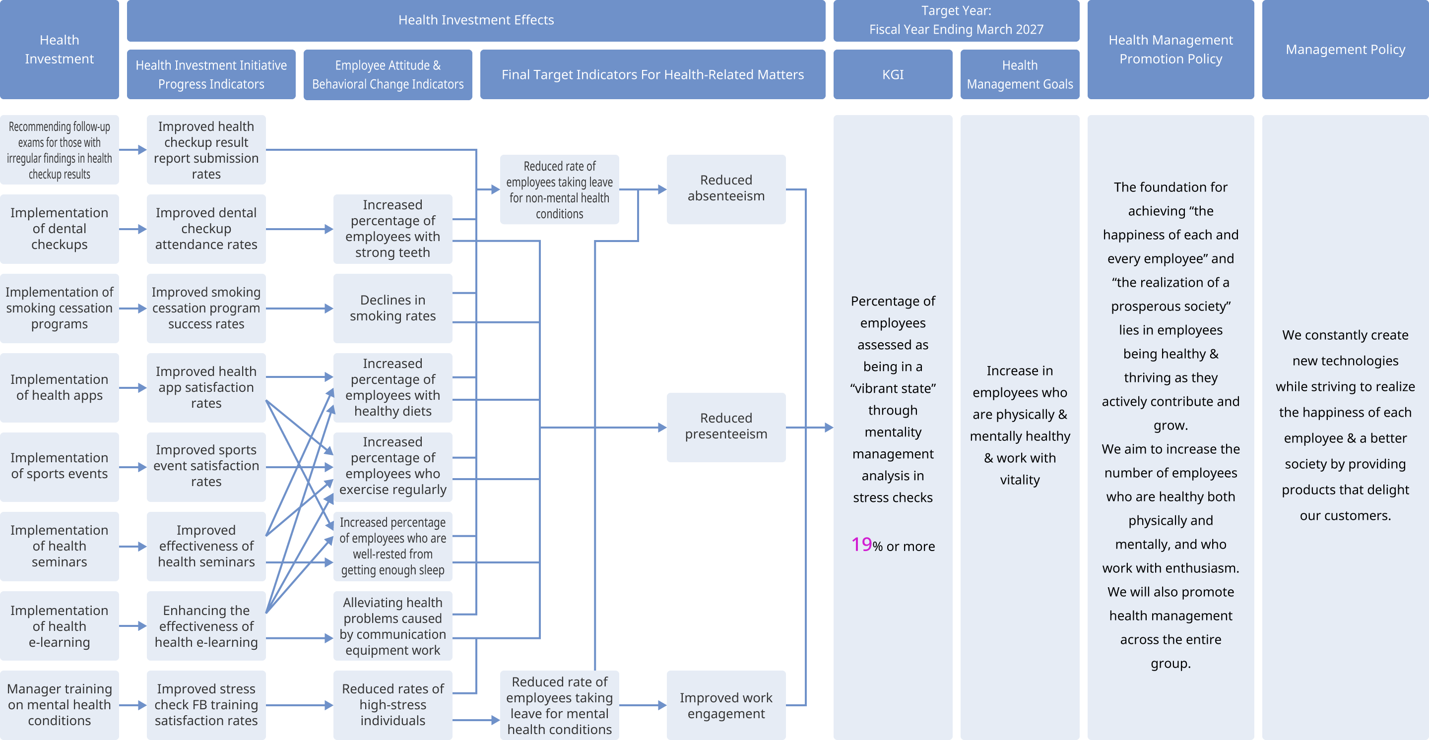 To address the management issues outlined in the Health Management Strategy Map, we have established KPIs for metrics related to employee health status and health management, along with the final target metrics. We are proceeding with various initiatives with the goal of improving all KPIs by the fiscal year ending March 2027. Regarding “Percentage of employees who are healthy, vibrant, and actively contributing to growth*,” which is one of our management issues, initiatives such as lifestyle improvements, enhanced communication, and mental health measures have led to a trend of annual improvement. The percentage was 67% in fiscal year 2023 and increased to 69% in fiscal year 2024.